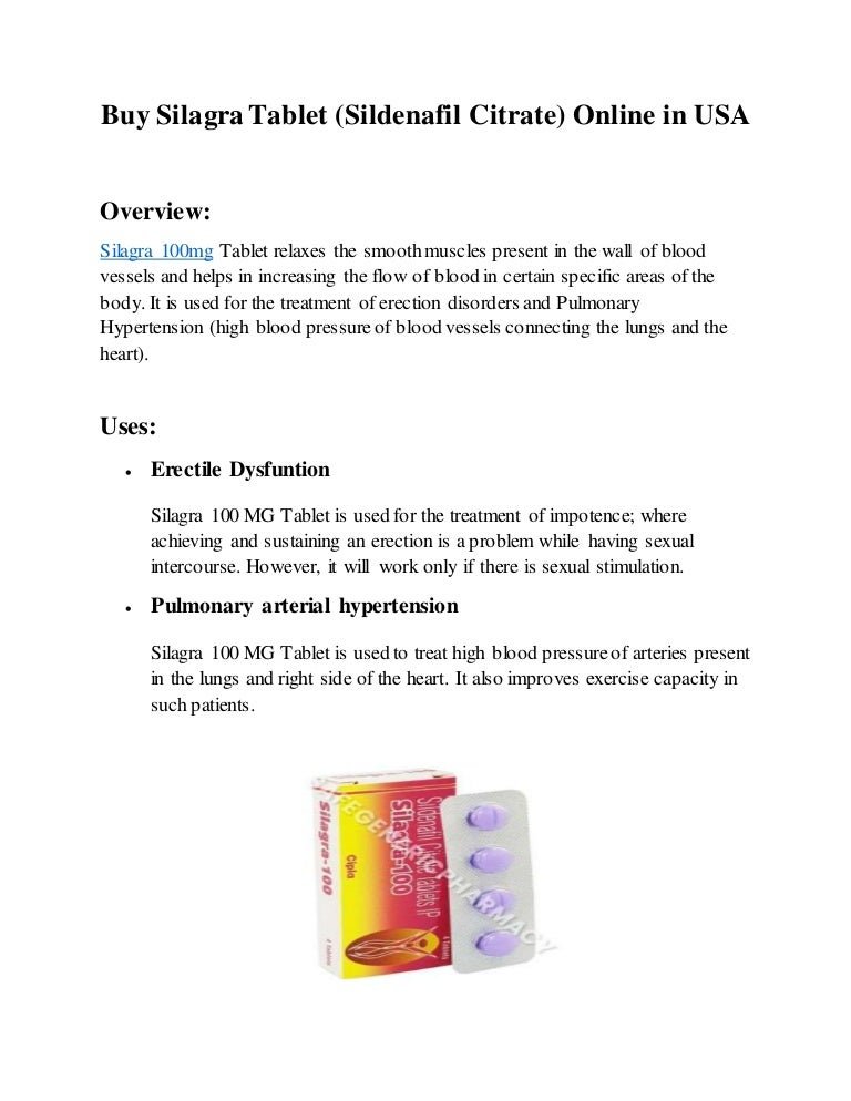 Principalmente, que es uno de los primeros medicamentos efectivos contra la disfunción eréctil. El sildenafil -conocido también van Viagra, Revatio, Herex, Clavupen, Sildenafilo o Disilden- es un medicamento inhibidor de la PDE5 fosfodiesterasa tipo 5 que se administra por la vía oral antes de la actividad sexual para ayudar a los primeros que sufren de disfunción eréctil a lograr y mantener una erección. En algunos casos, también podría ser prescrito familia tratar la hipertensión complete pulmonar, tal nice ocurre con fórmulas similares, como el tadalafilo o Cialis. Algunos medicamentos pueden interferir en la metabolización del sildenafilo y causar reacciones adversas. Se ha demostrado que el uso conjunto de este medicamento con anticoagulantes, como la warfarina, podría ocasionar un sangrado anormal. Los pacientes tratados con warfarina deben recibir un ajuste en la dosis son que sildenafil no interfiera negativamente en el tiempo de coagulación de la silagra 100mg online.